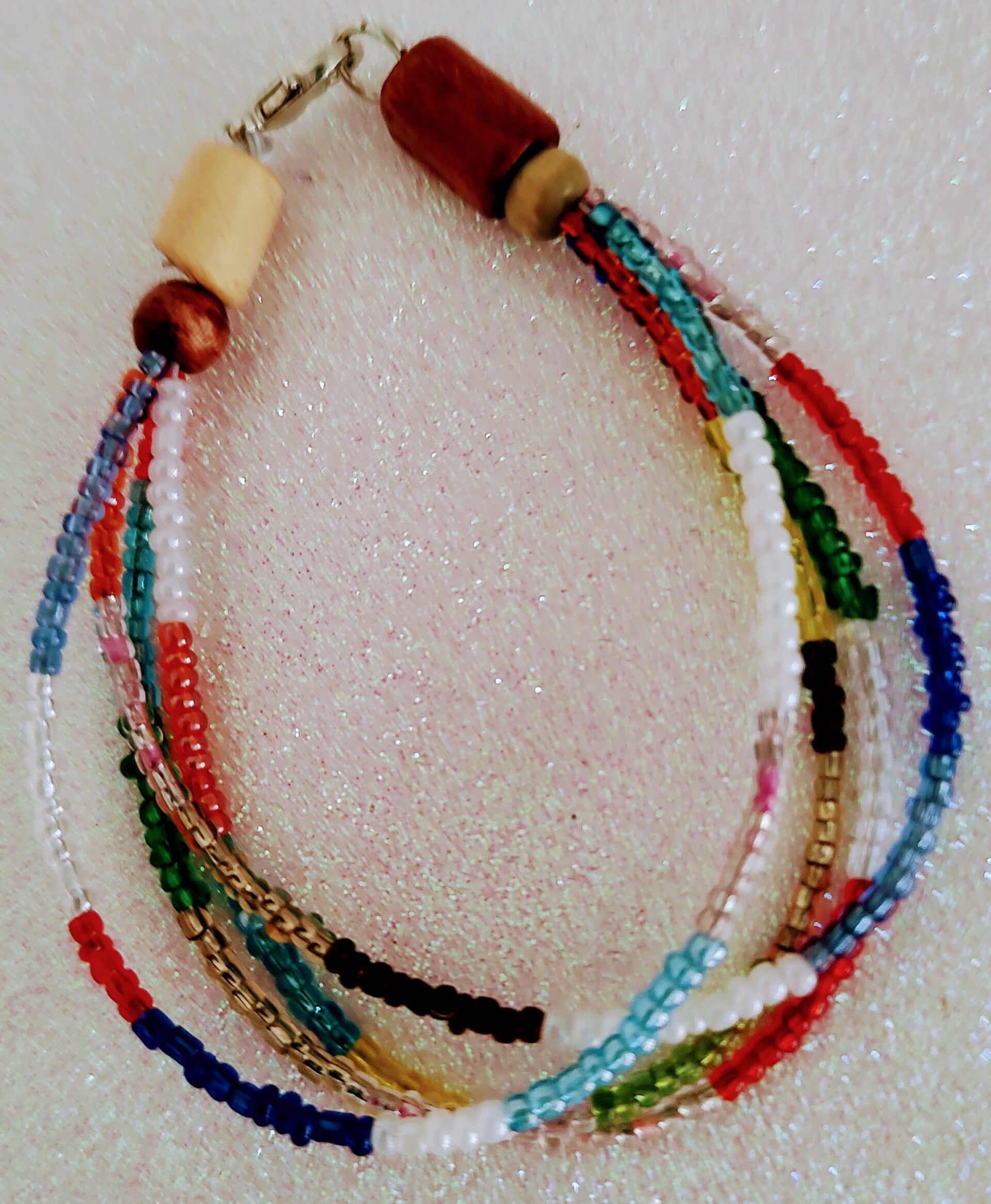 4-strands of fun colored seed beads and 2-polished wood beads at the clasp. Double wire for durability.
